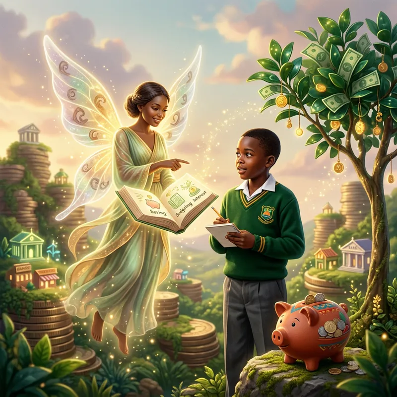 A 10-year-old South African school boy from Eastern Cape is in a mystical place known as Moneyland. There, he receives training on principles of money management and the basics of financial literacy. Assisting him is a money angel also known as a money fairy, who graciously imparts knowledge. They are surrounded by elements symbolic of finance and wealth such as a shimmering, golden dust sweeping the scene, a thriving money tree with glossy green leaves, and a sturdy piggy bank ready for saving coins. These elements come together, providing a vivid and imaginative representation of learning financial skills.