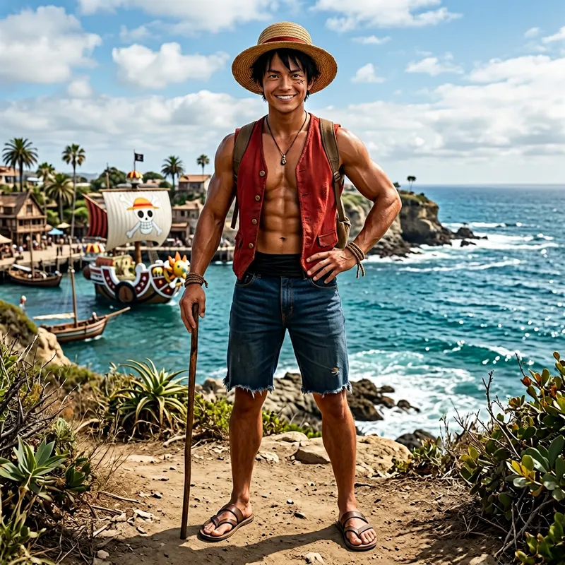 A tall, youthful, muscular man with black hair styled in a straw hat, wearing a red vest, blue shorts, and sandals. He has a long scar under his left eye and carries a confident and adventurous expression.