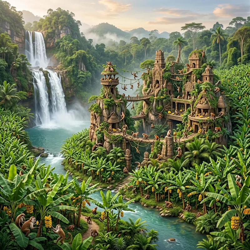 Monkey kingdom with banana tree borders with waterfall.