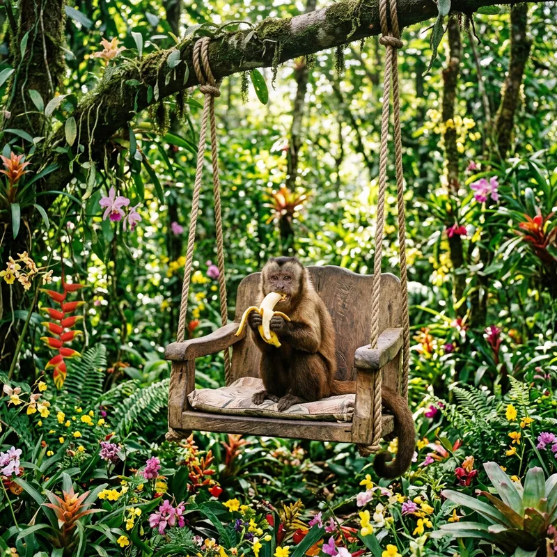 A monkey sitting on a swinging chair in the middle of the forest, surrounded by flowers, munching on a banana.