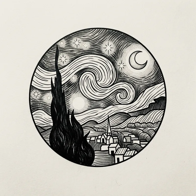 Generate a monochromatic, simplified image that can be utilized as a tattoo design for a couple. The design should draw inspiration from a tranquil night scene speckled with stars, reflecting the expressive brushstroke style and depth of color seen in pre-1912 Dutch post-impressionism, specifically reminiscent of a starlit sky as painted in oils. Ensure that the final output is optimized for the medium of tattoo art.