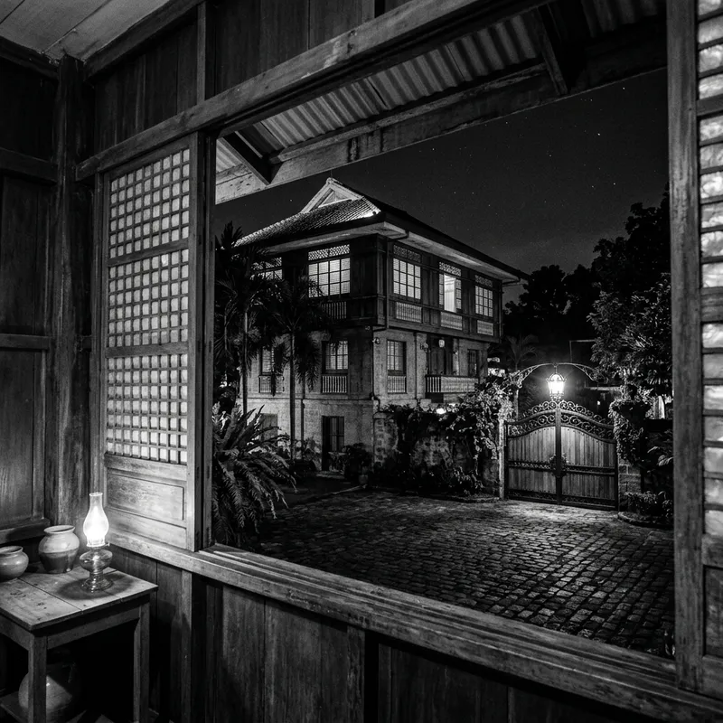 Create a monochrome image depicting a three-story house designed in a Filipino architectural style. Use the perspective of a person standing inside, looking outside towards the gate of the house. It is night time, therefore, the image must exhibit a nocturnal ambiance.