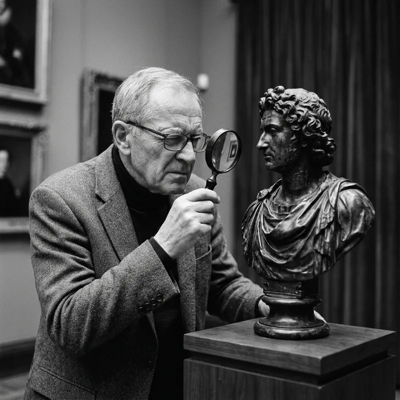 A black and white image of a person holding a magnifying glass, closely examining a sculpture. The person's focus is intent, revealing a deep sense of curiosity and appraisal. The sculpture is intricately detailed and stands on a pedestal, embodying an air of importance. The overall ambiance of the scene translated into monochrome enhances a timeless sensation, as if capturing a precious moment in the vast history of art.