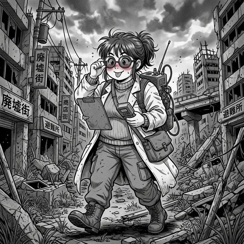 Illustrate a scene in monochrome akin to 90s anime style. The focal point is a female scientist of Japanese descent, with a more rounded figure. She wears oversized circle glasses with a darker shade. She's standing amidst the ruins of a neighborhood, creating a blend of an urban post-apocalyptic ambience. She is cheerfully exploring the scene, indicated by her blush and tongue playfully peeping out.