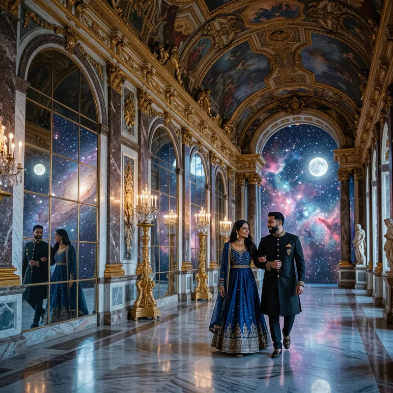 An extravagant interior space depicting the Hall of Mirrors, with its numerous reflective surfaces and elegantly sculpted columns. Two individuals, a South Asian woman and a Middle Eastern man, are leisurely strolling in this fantastic setting. The scene is bathed in the ethereal glow of a moonlit night, giving it a dreamy and mystical aura. The background unexpectedly transitions into a celestial vista filled with stars and nebulae, suggesting an otherworldly or magical atmosphere.
