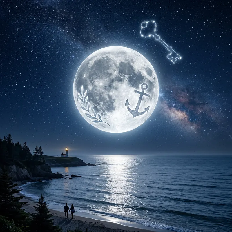 Visualize a beautiful scene where the large full moon is seen as a source of hope and optimism. The silver luminescent moon hangs high in the night sky, casting a calm and serene glow on the land below. The moonlight sparkles on the calm ocean, mirroring its image. Mixed in the astronomically accurate moon's surface details, are symbols of hope such as an anchor and a olive branch. The star-studded sky adds to the grandeur, with a constellation shaped like a key, signaling unlocking new opportunities. The overall ambiance of the scene is peaceful and soothing, inspiring positive feelings.