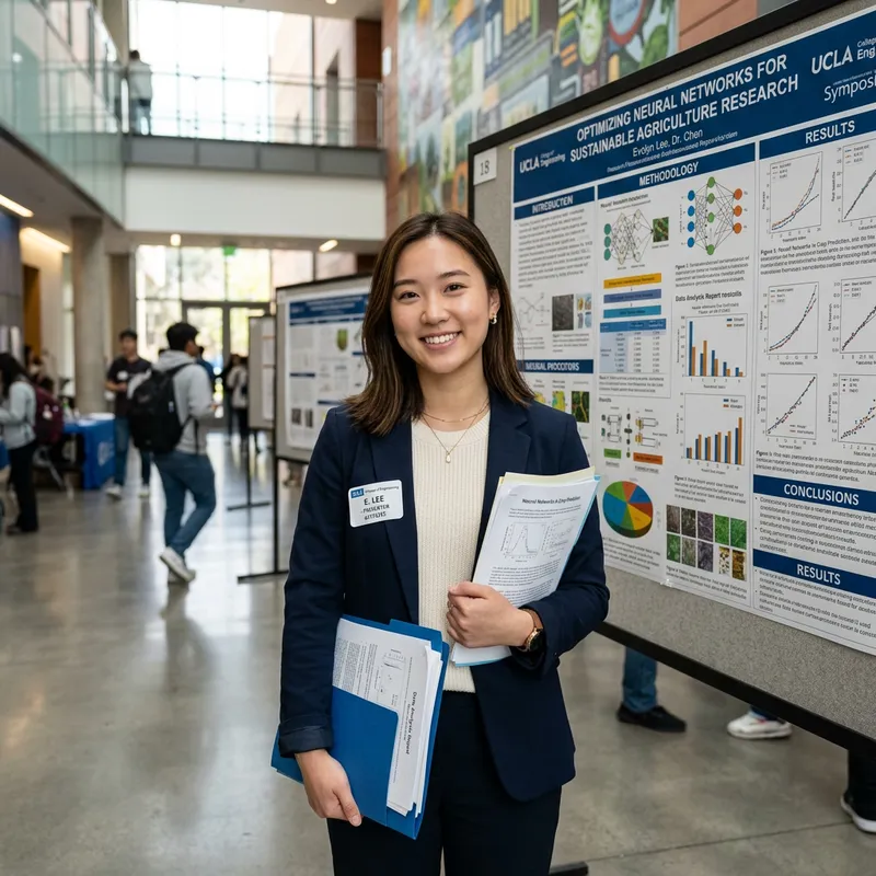 Light-skinned brunette Asian university student stands in front of a research mural with papers.