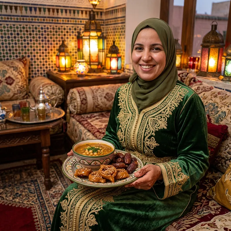 A Moroccan woman during the month of Ramadan. She is clad in a traditional kaftan and a hijab, holding a plate of delicious iftar meal comprising dates, harira soup and sweet pastries known as Chebakia. Her home is beautifully decorated with colorful Moroccan lanterns casting an inviting warm glow. There's a sense of peace and tranquility as she welcomes the end of the day's fast.