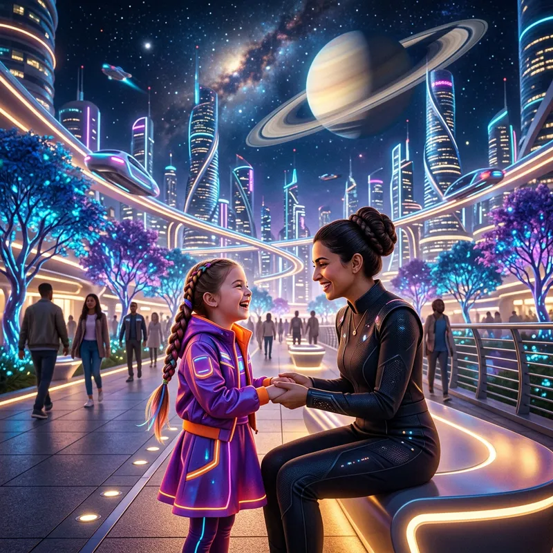 Mother and Daughter Bonding in a Whimsical Futuristic Setting