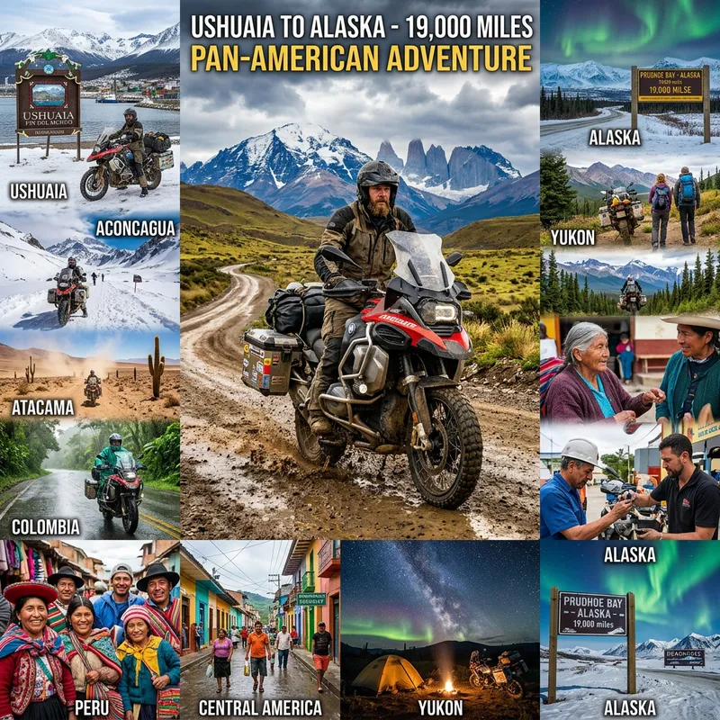 A vivid portrayal of a motorcycle journey from Ushuaia, Argentina to Alaska, USA. Picture the rugged landscapes, the change from icy mountains to exotic wildlife of the Americas. Imagine the motorcycle, its wheels fighting against different terrains, moving through pouring rain, hot sun, maybe even snow. Visualize the multitudes of cultures and people the traveler would meet on this journey, diverse in descent and gender. Picture campsites under the starry sky, vast open roads, and the awe-inspiring vistas of the Northern and Southern Hemispheres. Let each moment captured speak of an unforgettable adventure.
