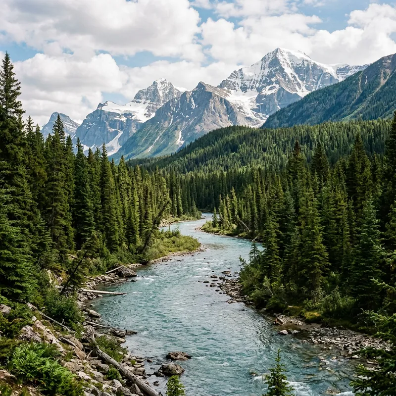 A photo of a river with mountains in the background, surrounded by a thick forest.