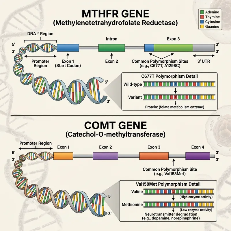 Scientific illustration showcasing the structure of MTHFR and COMT genes. The genes are visually represented as DNA double helix structures, with labelled sections to indicate their unique parts and functions. The MTHFR gene appears as a sequence of colored base pairs, corresponding to its unique genetic sequence. Similarly, the COMT gene is distinct and marked by its characteristic pattern. The background consists of a clean, neutral surface which enhances visibility and understanding of these crucial elements of human genetics.