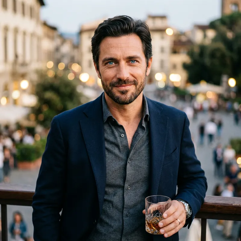Man with sky blue eyes, dark hair, gentle and seductive gaze between 40 and 50 years.