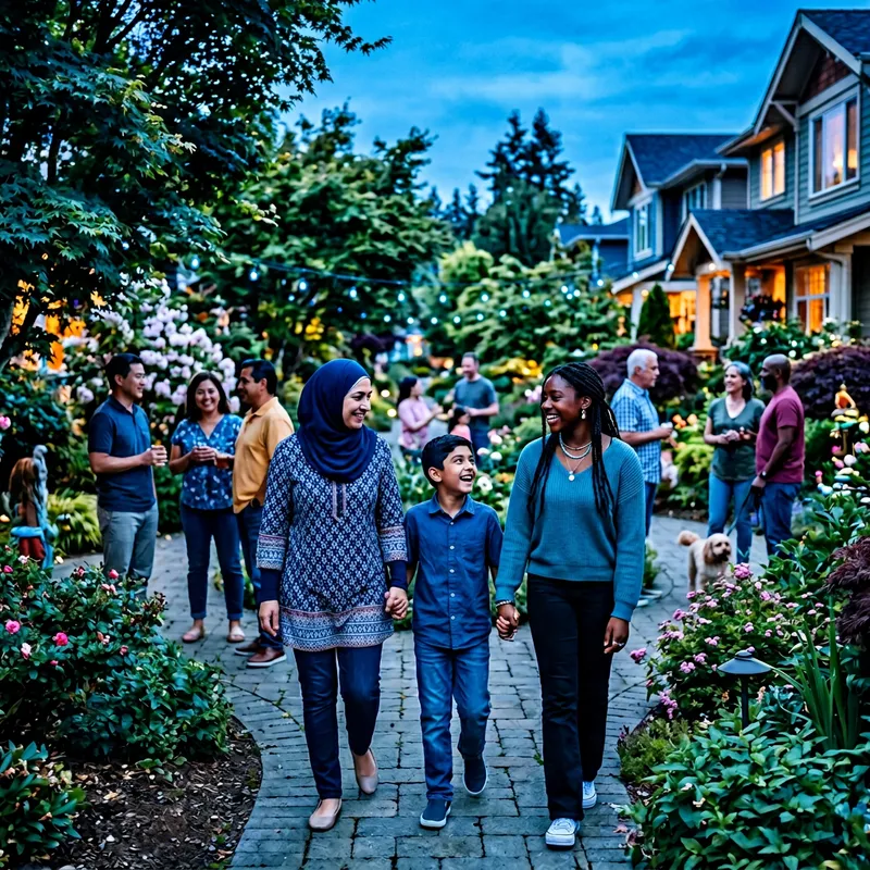 A multicultural family unit, consisting of a Middle-Eastern mother, a South Asian son, and a Black older daughter, cohabiting in a state of harmony and peace. They are enveloped by a supportive community filled with compassionate individuals of diverse descents. This heartwarming scene is cast in soothing blue tones, encapsulating a sense of tranquility and unity. The environment around them is stunning, with lush landscapes and well-kept homes demonstrating a serene neighborhood where love and understanding reign supreme.