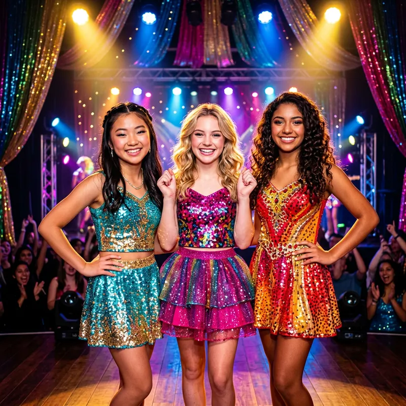 Three girls on a stage; the first being East Asian descent, the second being of European descent, and the third of Hispanic descent. They are all in a confident pose, smiling at the camera. The spotlight is highlighting their cheerful expressions and their bright, colorful outfits enhancing the vibrant ambiance of the stage which is decorated with glittery drapes and dazzling lights.