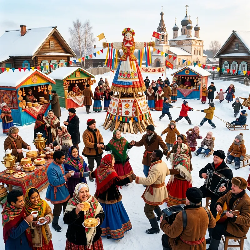 A traditional celebration during the Maslenitsa festival in Russia. The scene is set in a quaint rural village, where joyous and lively crowds gather. Men and women of various descents, such as Caucasian, Hispanic, Black, Middle-Eastern, and South Asian are taking part in festivities. The square is filled with vendors selling food and drink, children playing games, and everyone enjoying the festive atmosphere. The bright colors of traditional Russian outfits fill the scene. In the background, a large wooden effigy representing winter (Lady Maslenitsa) is ready to be burned as part of the tradition.