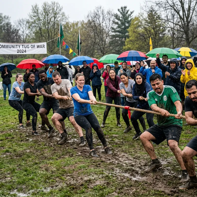 A captivating image of a tug of war competition. Two groups of multicultural, diverse people are engaged in a spirited game, their faces reflecting immense concentration and determination. One group consists of a balanced mix of male and female participants of Caucasian and Black descent, whereas the other group represents individuals of Hispanic and Middle-Eastern descent, also with an even gender distribution. The rope stretched taut between them is vibrant, a stark contrast against the grassy field they're standing on. Supporters cheer from sidelines, huddled under colorful umbrellas as a slight drizzle begins to fall.