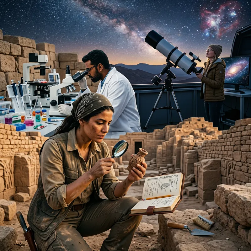 A captivating image representing the adventure of a research journey. In the foreground, an Middle-Eastern female archeologist with her notebook open in one hand, a magnifying glass in another, examining an old artifact in an ancient civilization site. In the background, a South Asian male biotechnologist, donned in a lab coat, peering into the microscope, surrounded by brightly colored biological samples and complex scientific equipment. To the far right, a White female astrophysicist gazing into the starry skyline from her observatory, a telescope beside her projecting images of celestial bodies. A vivid blend of science, history and exploration.