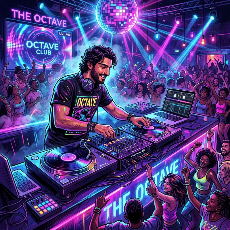 Create a vibrant illustration of a multiracial male DJ with Caucasian and Middle Eastern descent, mixing music at his station. Surround him with various pieces of equipment, such as turntables, headphones, and a mixer. The setting is in a lively nightclub. Use a neon color scheme highlighting the energetic ambiance with hues of blues, purples, and pinks, highlighting the contours of the DJ and his equipment. Include strobing lights emanating from the disco balls above and the crowd in the background, absorbed in the rhythmic beats.