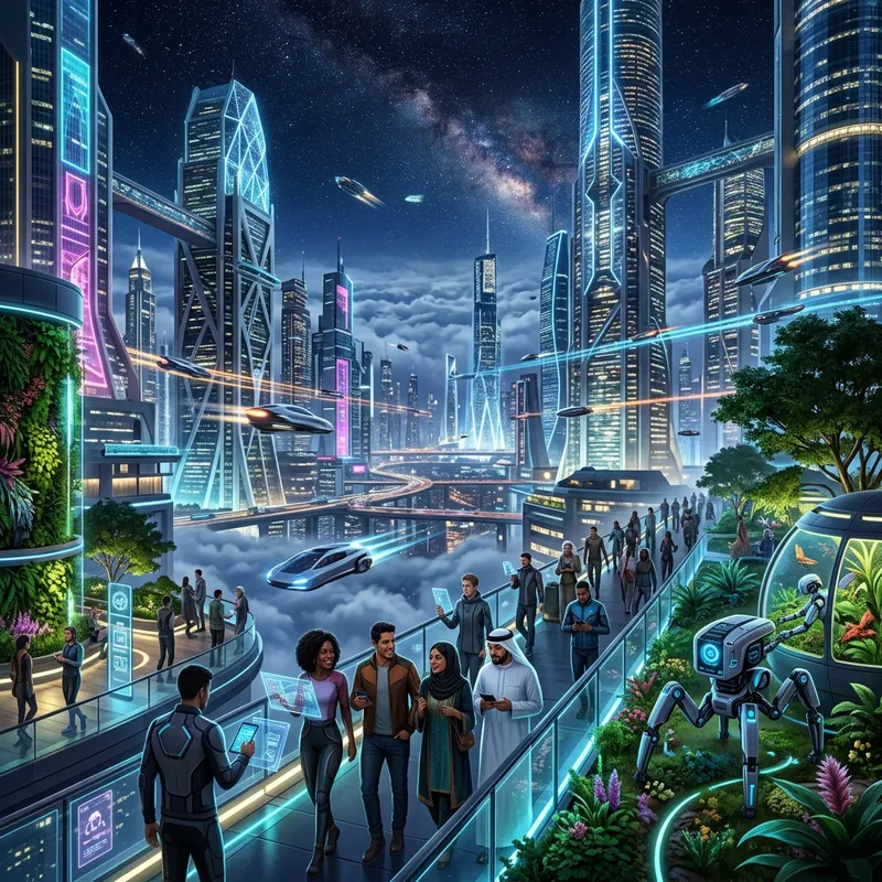 Visualize the world in the year 3000. The advanced cities have skyscrapers reaching up to the clouds with flying cars crossing between them. People of diverse descents like Black, Hispanic, Caucasian, Middle-Eastern, and South Asian are walking around, interacting with futuristic technology. There are green spaces in between the metal and glass structures where automated robots help in maintaining the flora and fauna. The sky is filled with stars, making the futuristic skyline twinkle.