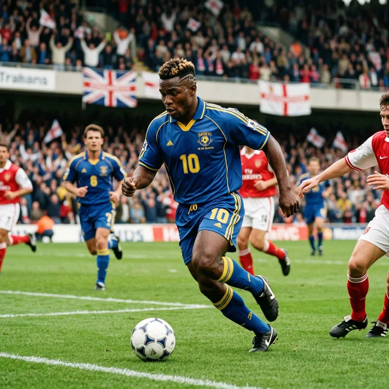 A powerful football player with a unique haircut characteristic of the late 90s. He is a muscular athlete, wearing a blue and yellow uniform. He dribbles the ball swiftly down the soccer field, showing off his adept skills and footwork. His short and unique hairstyle makes him stick out on the field. The greens of the field contrast with the bright outfits of the players. Spectators cheer from the grandstand, absorbing the tension and excitement of the match.