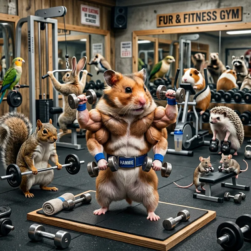 Muscular Hamster Weightlifting at Gym with Other Animals