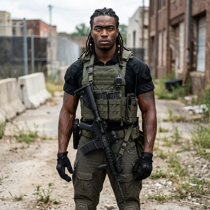 A muscular man with a striking feature of one eyebrow and adorned with dreadlocks on his head. He possesses a unique set of eyes, one being blue and the other red. Showing his readiness for possible threats, he is clad in protective gun armor.