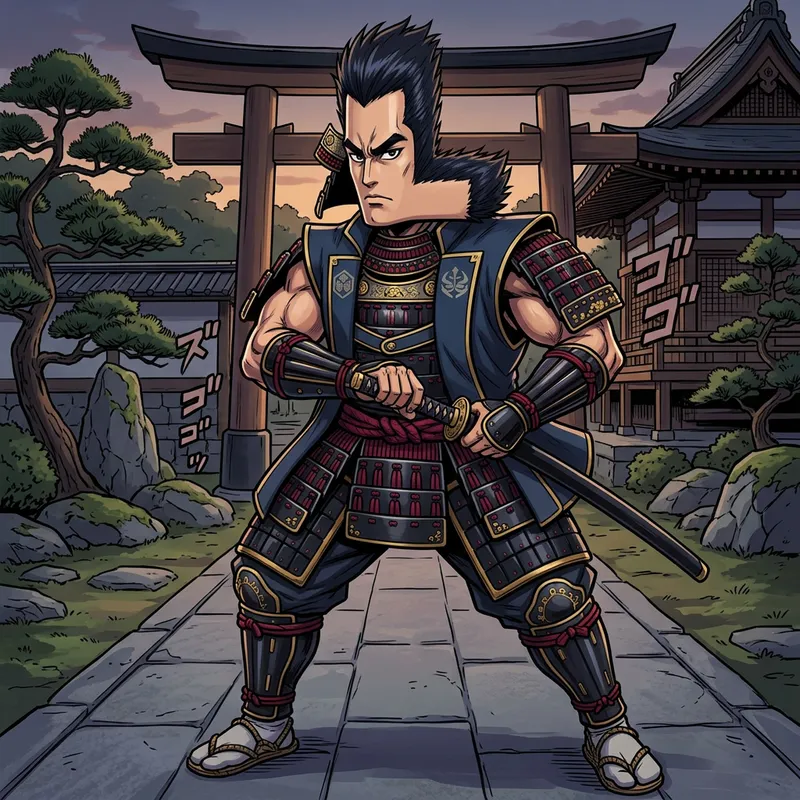 A man with an impressive muscular build is seen wearing a suit of traditional samurai armor. Fascinatingly, his head is unusually shaped, resembling the letter L. His appearance is captured in a style reminiscent of animated Japanese illustrations, typically known as anime. Visuals are reminiscent of graphic novel characters with large expressive eyes, exaggerated features, and dynamic poses.