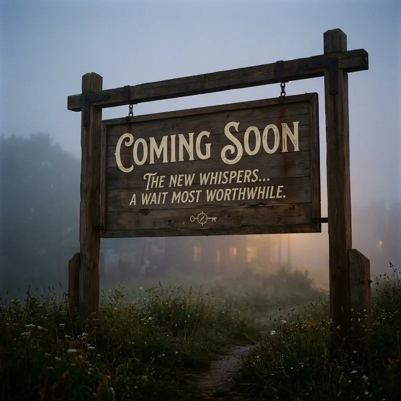 Generate an image of a large, intriguing 'coming soon' sign, enveloped in a sense of mystery. The sign stands tall against a backdrop of thick, creeping fog, emphasizing its looming presence. Periodic absence of light and shadow suggest that the environment is filled with suspense and secrecy. Despite the arcane atmosphere, the sign remains clear and welcoming, intriguing passersby with its promise of upcoming surprises.