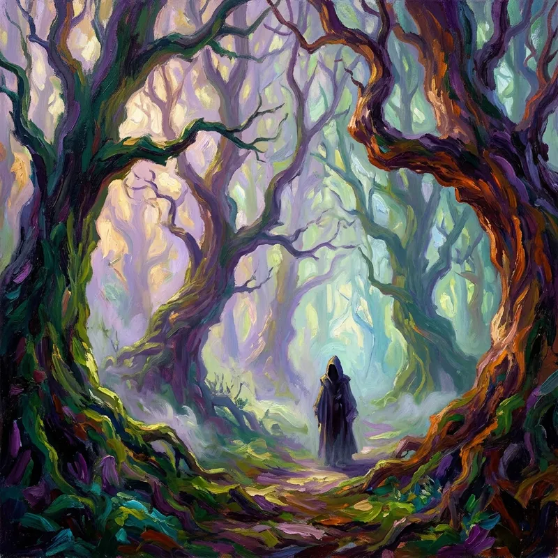 A mysterious figure standing in a foggy forest. The vibrant colors and bold brushstrokes, reminiscent of pre-1912 impressionistic art, evoke a sense of an unseen, otherworldly presence. The scene is presented with a hint of a wide-angle perspective to highlight the vastness and mystery of the woodland, infusing it with a fantasy-inspired ambiance.