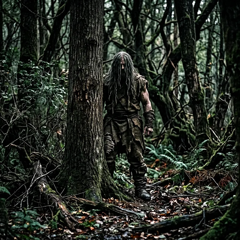 A towering and moderately muscular male creature of unspecified descent, his face obscured by a curtain of long hair, lurks among the dense tree line at the edge of an ominous forest. The creature seems daunting and frightening, hinting at a deeper darkness. Only a hint of its face is visible. Viewed from a distance, the full-bodied entity seems to blend into the shadows, with one of its legs subtly peeking out from behind a sturdy tree trunk. As he stares straight ahead, the distance between him and the camera lens amplifies his enigmatic and smaller presence, enhanced by the atmosphere of frightful secrecy. The scene is set in a photorealistic style, accentuating the eerie details. The overarching ambiance is mysterious and dark, and the further details infused into the setting elevate the sinister undertones in the scene.