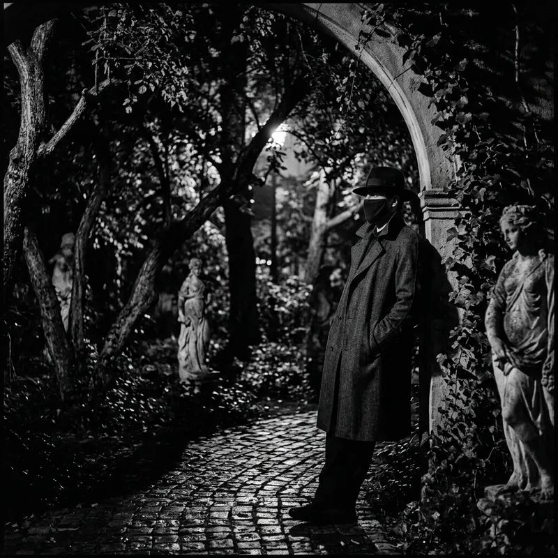 a mysterious masked figure in a serene garden, inspired by classic film noir, black and white photography, enigmatic poses, medium format film camera, medium format film camera, haunting atmosphere