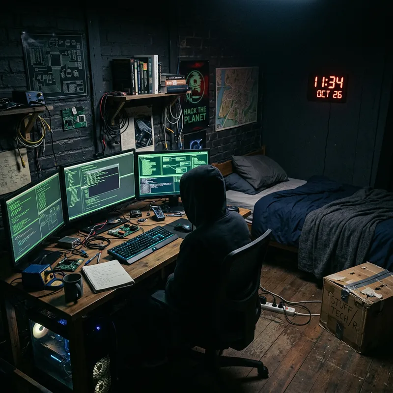 An atmospheric image of a mysterious, dimly lit room. The room's dominating feature is a well-equipped desktop computer set up, radiating digital glow, giving off a hacker-like vibe. Next to the workstation, against the wall, there's an unadorned single-person bed ready for rest or late-night pondering. Additional elements include a radiant digital clock projecting time in an obvious yet subtle manner, and a weather-beaten cardboard box tucked away in a corner, hinting at a simplistic lifestyle or recent relocation.
