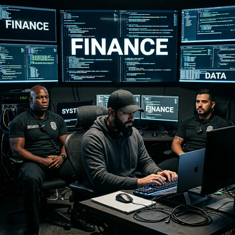 A male software engineer of Middle-Eastern descent sits in a chair in a dim room. His hat is pulled low over his eyes, giving him a mysterious aura. High above and around him, large monitors displaying the word 'Finance' glow in the darkness. The screens show various software codes adding a sophisticated ambiance. On his right and left, bodyguards of Hispanic and Black descents add an extra layer of security. This creates a riveting environment for the diligent coder.