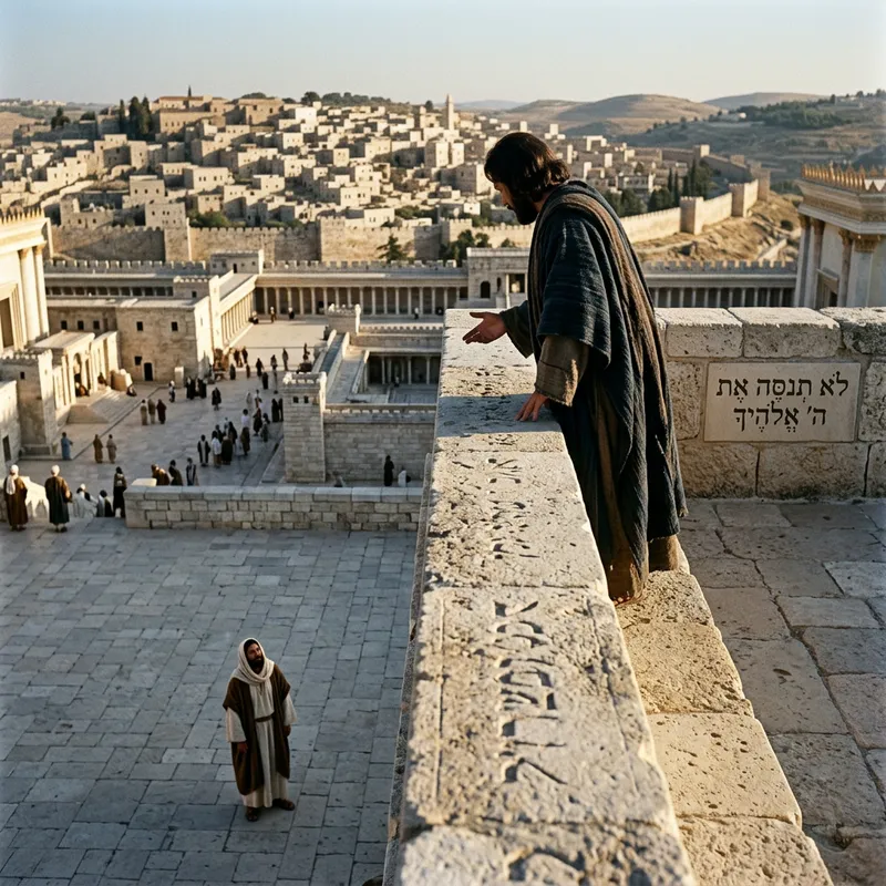 An image displaying a scene in Jerusalem atop a temple. In the scene, a figure is standing on the edge of the temple's highest point, speaking to another figure below him. The conversation revolves around a challenge, the proof of divine patronage, and the protection of angels. In reply, the standing figure proclaims the principle of not testing their deity. As the conversation ends, the challenger figure distances himself awaiting the right moment.