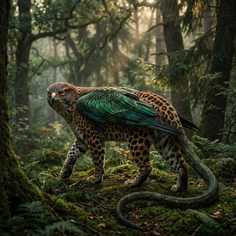A mystical creature from ancient folklore, often depicted as a combination of parts from multiple animals. It has the head of a hawk, the body of a leopard, and the tail of a serpent, all gripped with ferocity. The beast roams through dense forests and its fiery eyes hold a hypnotic power. It is unclothed, striding on its muscular legs. Every so often, it flexes its wings that are adorned with shimmering feathers resembling emeralds. The sight of this beast can cause one to freeze in fear, yet its majestic appearance also lures the brave to approach it.