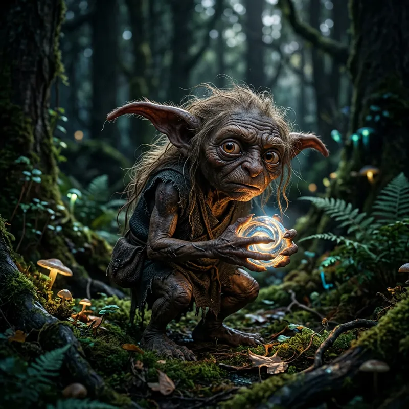 A fantastical creature, small in stature, with big, expressive eyes and elongated, pointed ears. It possesses a hunched posture and its body has a rough, leather-like texture. Its sparse tufts of hair are stringy and unkempt. It carries a mysterious, glowing object tightly clutched in its hands.