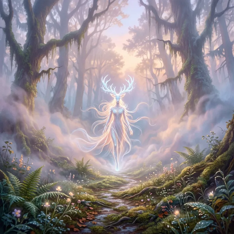 Imagine a mystical creature, an ethereal being woven from the threads of fantasy, as it emerges slowly from a dense cloak of fog. Its surroundings are softly lit, steeped in dreamy, ethereal landscapes with the colors of a pastel painting, more suggested than defined. Its form moving with an uncanny grace that seems to ebb and flow with the rhythm of the wind itself. The view is captured with a wide-angle lens perspective, revealing the full scope of the creature's environs, from the smallest dew-laden leaf to the grandeur of towering, misty forest trees.