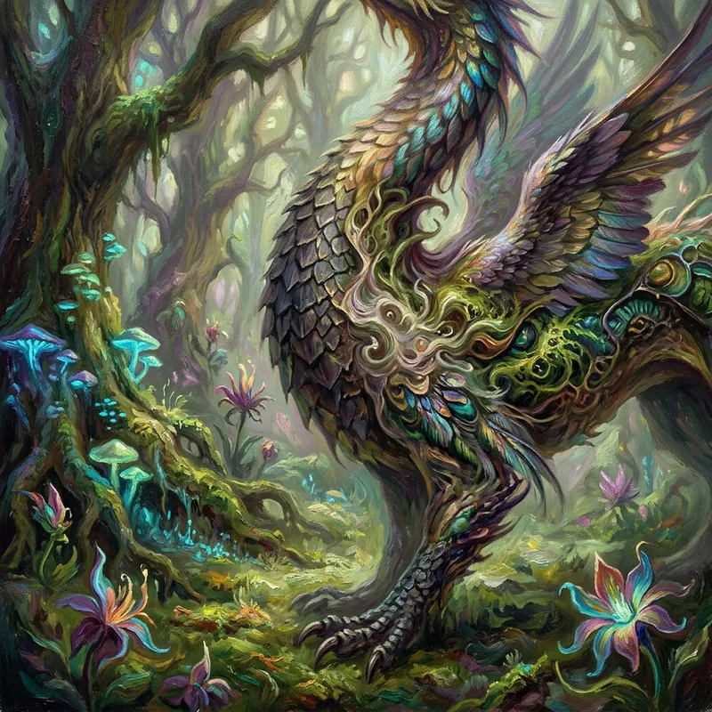 Imagine a mystical forest glade enchanted with vibrant colors and a dreamlike atmosphere in the style of surrealism, synonymous with the creations of artists from the pre-1912 era. It hides a creature in mid-transformation, skillfully portrayed as if captured with a macro lens. The brush strokes emphasize the intricate details of the creature, echoing the astoundingly precise nature of illusion. The entire tableau is reminiscent of a fantasy-inspired composition, further highlighting its fantastical essence. No human figures indicate signs of existence, allowing the essence of the forest and the creature to wholly dominate.