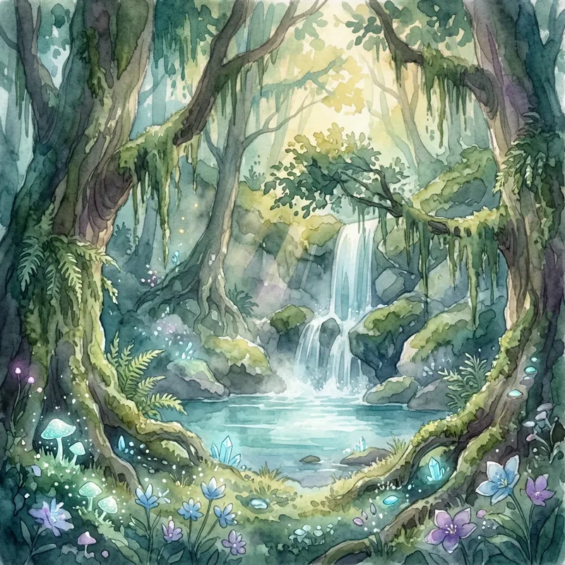 a mystical forest with a hidden waterfall, captured in the style of dreamy watercolor paintings, ethereal and magical atmosphere, lush greenery, hidden gems, digital painting with soft brushstrokes, fantasy-inspired