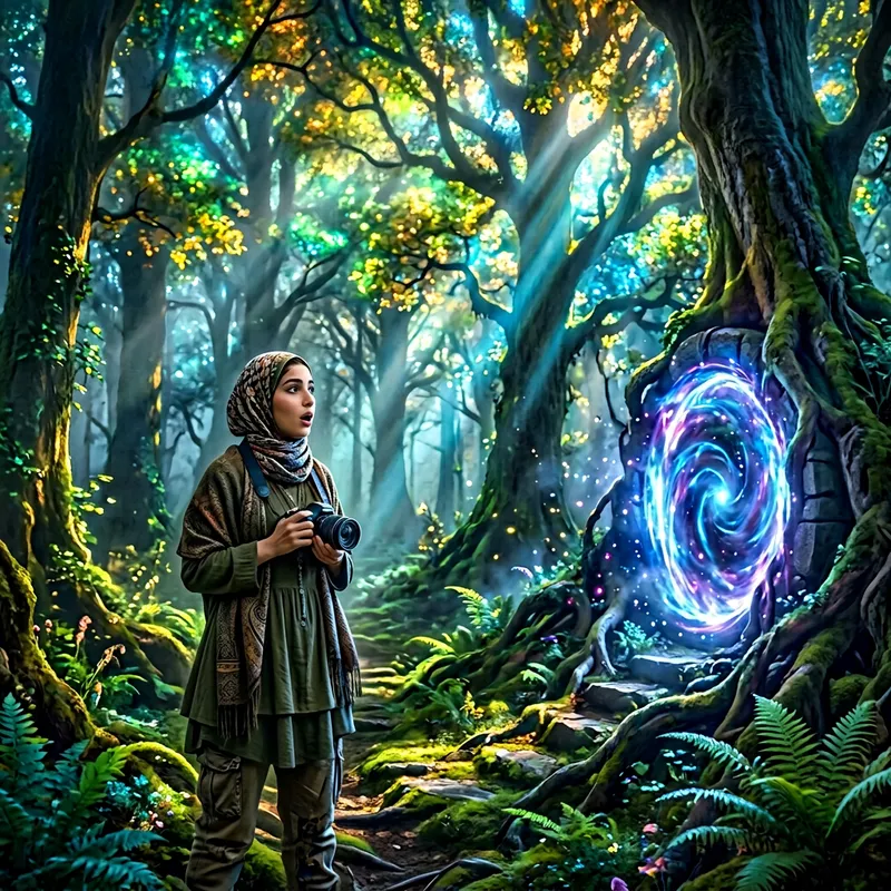 Imagine a mystical forest scene with trees shrouded in a mist of enchantment. The leaves of these tall, majestic trees are glowing under the soft brushstrokes of the impressionistic style, reminiscent of artists who worked prior to 1912. Rays of ethereal light stream through the branches, casting a dappled pattern across the understory. Nestled deep within this forest is a glowing portal, pulsating with an unknowable energy. Near this otherworldly spectacle, a Middle-Eastern woman, her eyes wide in awe and wonder, stands capturing the enchantment. Furthermore, this scene is envisioned as a photorealistic image, captured through a Canon EOS R6, with an optimal setting of aperture f/4 and a 24-105mm lens. A tangible embodiment of a fantasy-inspired view.