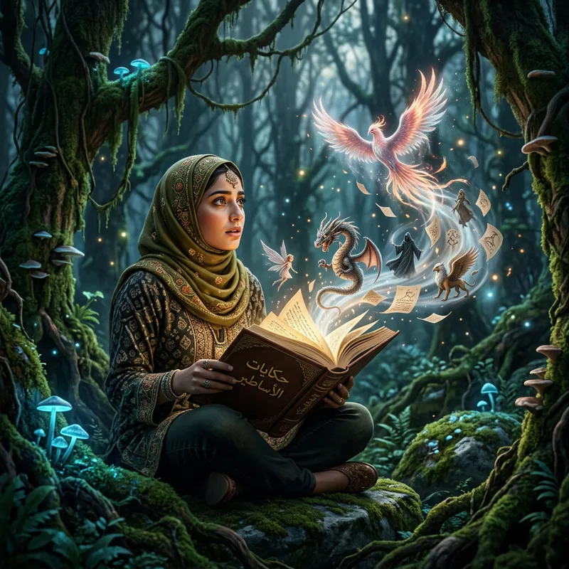 A Middle-Eastern woman is in the heart of a mystical forest, reading an ancient story book. The forest has a unique sense of mystery and the contents of the book seem to come to life. Trees surrounding her are gnarled, and moss-covered rocks jut out, giving the place an eerie vibe. As she flips through the pages of the book, strange creatures and mythical beings described in the stories emerge from the paper in a surreal fashion, creating a fantastical scene. The woman's expression is filled with awe and a slight touch of fear, captivated by the lifelike manifestations of the book's tales.