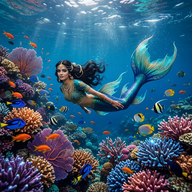 Imagine a charming underwater realm, where a mystical Middle-Eastern mermaid glides gracefully amidst a brilliant medley of lively fish of various shapes and radiant colors. Intricate coral formations extend out from the ocean floor, boasting an array of iridescent hues and glowing highlights, thereby encapsulating the ethereal beauty of this underwater scenery. The scene is captured as though taken via a professional undersea camera, manifesting the fantastical domain underlying the ocean waves, and emanating a certain sense of wonder and enchantment.