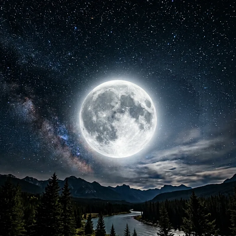 A large, luminous moon hanging in the dark expanses of a serene night sky. The moon is glowing with an ethereal silver light, illuminating the surrounding darkness with its brilliance. It appears grand and mystical, a celestial beacon guiding the nocturnal creatures below. The sky around the moon is a rich tapestry of twinkling stars, that appear like tiny shimmering diamonds studded into the endless velvet darkness.