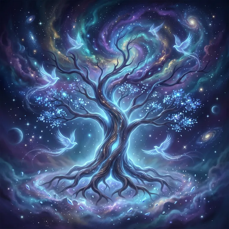 a mystical Tree of Life in a celestial setting, branches stretching toward a swirling nebula, illuminated with a soft blue light, ethereal birds soaring around, digital painting with luminescent airbrush techniques, cosmic fantasy