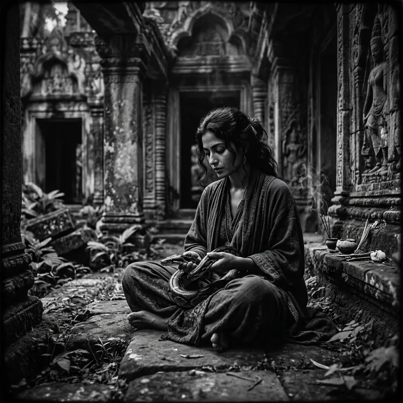 An ancient temple ruin basked in the twilight glow. A woman of undefined descent seated on the ground in a relaxed pose, carefully holding a snake in her lap. She is clad in attire painted with deep shades of violet and emerald green. The dramatic lighting around her casts eerie shadows, adding to the scene's intensity and mystery. This moment is imagined to be captured in a vintage film camera giving it a grainy black and white aesthetic, hinting at themes of the occult.