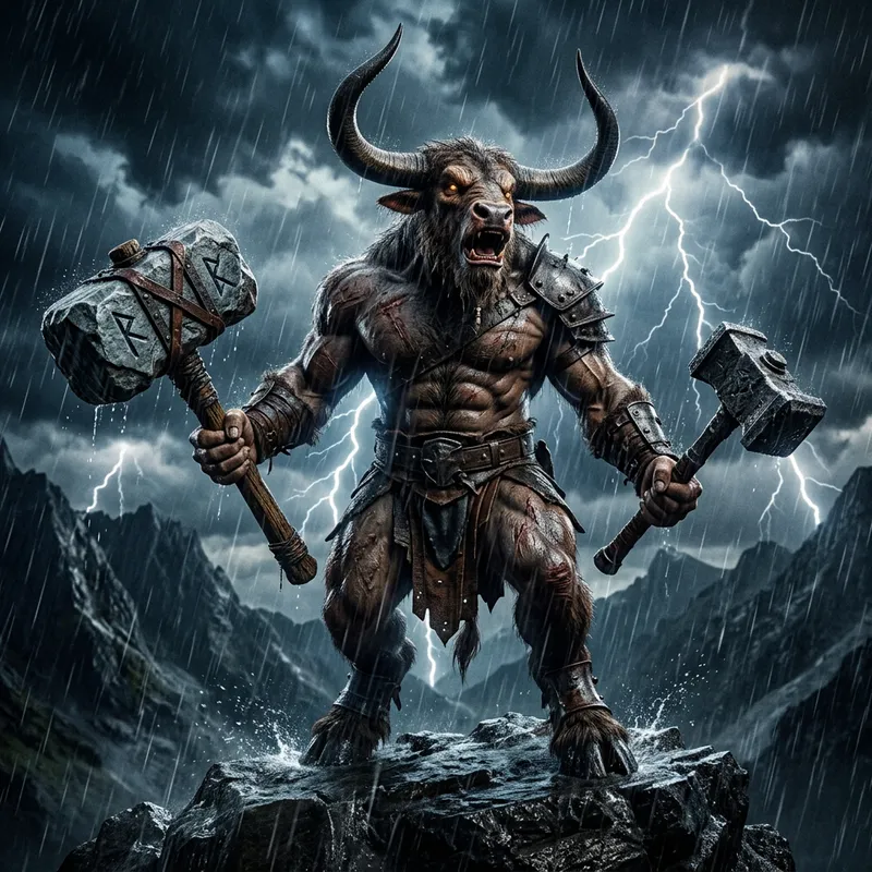 Mythic Minotaur in Thunderstorm with Powerful Hammers