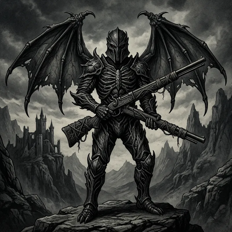 Full-sized image of a mythic villain with each armor appearing as though it's made from living organic material. He is brandishing a rifle in his hands and has large wings sprouting from his back. His style is characterized by dark, intense, and sinister attributes, mirroring the visual style of pre-1912 Gothic Art, utilizing mostly black and grey tones.