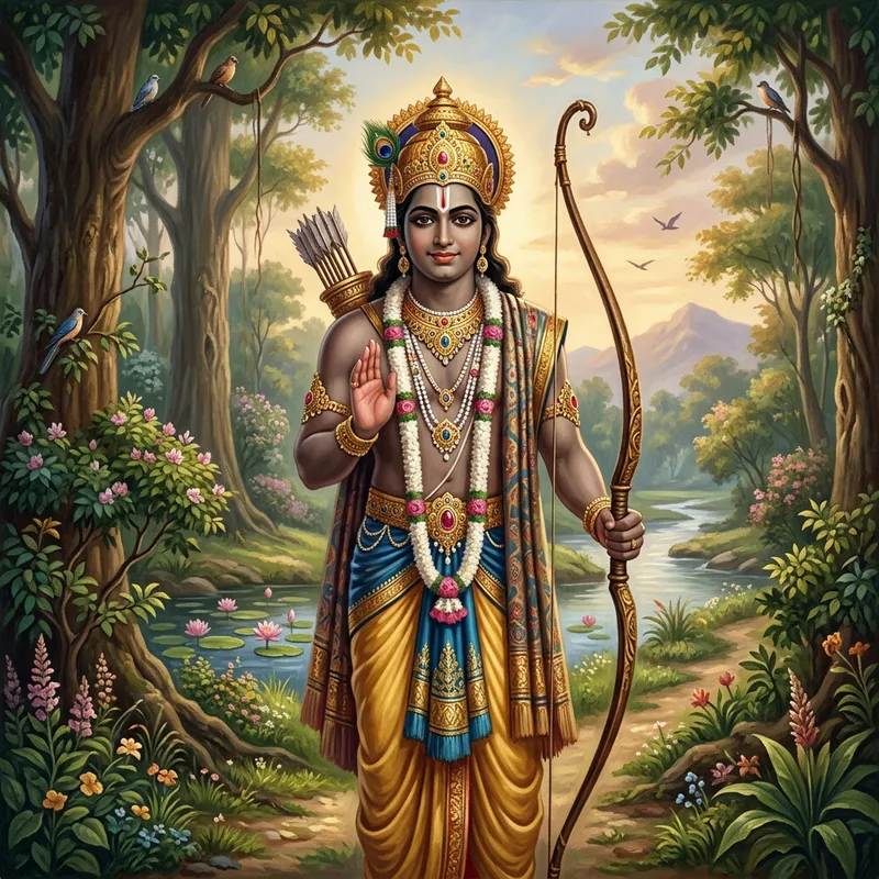 A representation of the mythical figure known as Ram from Hindu mythology. Portray this figure in traditional attire, including a crown and bow, posing in a serene natural environment.