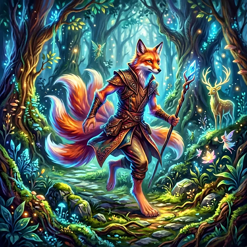 A mythical creature bearing the resemblance to a man but with distinct fox-like features. His form is painted in vibrant hues that create an ethereal play of light and shadow on his figure. He can be seen prowling through an enchanting forest, weaving tales of folklore and fantasy into the reality of the scene. The detailing of this visualization is akin to a digital painting with soft brushstrokes. To capture the essence of the scene, include elements commonly associated with fantasy like unearthly foliage, magical creatures in the background, and a mysterious atmosphere.